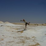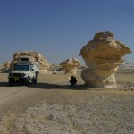 Seltsam kommen uns die vielen Reifenspuren vor, die direkt in die Wüste führen. Wer mag hier warum wohin gefahren sein? Dann entdecken wir die Spuren der Baufahrzeuge, die diese Straße gebaut haben. Vor mehr als dreissig Jahren! Anders als wir dachten, halten sich Reifenspuren in der Wüste viele Jahre, oft jahrzehntelang. Ladislaus Almasy (gewissermaßen der ‚echte‘ englische Patient) hat diesen Teil der Sahara in den dreißger Jahren erforscht und ausführlich darüber geschrieben (danke Cornelia für den Buchtipp – grandios!). 1929 hat er auf der Suche des legendären Darb al Arbe’in, der ‚Straße der vierzig Tage‘, der alten Karawanenstraße, auf der nubischen Sklaven einst nach Ägypten gebracht wurden, diesen Teil der Wüste von Wadi Halfa bis nach Asiut mit dem Auto durchquert. 1929! Wir finden das um ein vielfaches abenteuerlicher, als das was wir hier tun. Aber auch er fand sein Vorhaben wenig abenteuerlich im Vergleich zu seinem Vorgänger Rohlfs, des dasselbe fünfzig Jahre früher mit einer Kamelkarawane und den Navigationsinstrumenten seiner Zeit geschafft hat. Wie ist doch alles immer relativ… Mit den alten Reifenspuren, die sich wie Wunden durch sie ziehen, erscheint uns die Wüste verletzlich, aber an anderer Stelle zeigt sie uns ihre Macht und Unbezwingbarkeit. Wenn die Natur findet, dass an eine bestimmte Stelle eine Düne hingehört, dann ist dort eine Düne. Egal, ob da Menschen irgendwann mal ein Straße hingebaut haben… Dann ist da noch der Sternenhimmel. Er ist ein bißchen wie in den Bergen oder auf See. Sehr weit und unendlich tief, irgendwann glaubt man, an jedem Punkt einen Stern zu sehen. Wir suchen für unser Nachtlager einen Platz in der White Desert – und stehen auf einmal wie in Gletschereis. Schneeweiße glatte Kalk- oder Kreidefelsen soweit das Auge reicht, dazwischen bizarre Steingebilde an denen man sich kaum sattfotografieren kann. Wir kommen uns vor wie im Disneyland, aber es ist mal wieder die Natur. Und wir sind völlig allein bis auf eine Kamelkarawane, die abends vorbeizieht, und eine kleine Wüstenspringmaus, die uns am späten Abend noch besucht. Sonst nur wir, die Wüste und der Sternenhimmel.