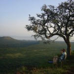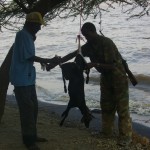 Die Landschaft hat sich wieder völlig verändert. Es ist flacher geworden, wärmer, und die grünen Berge sind einer Savannenlandschaft gewichen. Hier sieht Afrika aus, wie man es sich vorstellt. Zum allerersten Mal haben wir uns mit Michael und den Iren, die wir seit Wochen nur durch loses Austauschen der Reisepläne immer wieder treffen, für den Abend fest verabredet. Nur leider ist das Camp wo wir uns treffen wollen, seit Wochen geschlossen, und die umliegenden Lodges nehmen keine Camper. Ohne Internet können wir einander nicht kontaktieren, alles ist hier weit verstreut und so haben wir wenig Hoffnung, unsere Freunde bald wiederzusehen. Als wir aber endlich – es wird schon langsam dunkel – eine Campsite am See gefunden haben, prostet uns schon von der Terrasse ein fröhlicher Michael zu. Wir lassen uns an einem idyllischen Platz unter Schirmakazien am See nieder. Es gibt Hippos, Tilapia und Pelikane, jede Menge bunte Vögel, und direkt über uns nistet ein Fischadlerpärchen. Das Restaurant wird von einem charismatischen Amerikaner namens Edward und seiner Frau Jazzie betrieben, die zwar äthiopischer Herkunft ist, aber lange in den USA gelebt hat, amerikanischer kaum sein könnte und einen kleinen, total unäthiopischen Kläffköter namens Poogie-Boo besitzt. Es ist schon lange dunkel, wir haben gerade unsere köstlichen Burger verdrückt, da treffen – schwupps – die Iren ein. Wir beschließen, ein paar Tage zu bleiben, denn Jazzie macht uns ein Angebot, das wir nicht ablehnen können: am nächsten Tag wird eine Ziege geschlachtet, und es gibt Campfire mit Barbecue am Strand. Kann das Leben schön sein! Wir verbringen unbeschwerte Tage in der Hängematte, paddeln in Kanus herum, üben mit der Zwille zu schießen (nur halb so furchteinflößend wie eine AK 47) wir faulenzen, lesen und beobachten die Adler.