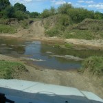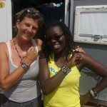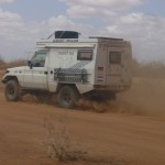 Uns war klar, dass Kenia teurer als Äthiopien sein würde, aber 15 USD pro Person für einen Campingplatz ohne jede facilities finden wir doch ein wenig übertrieben. Wir wenden uns hilfesuchend an die örtliche Polizeistation, und siehe da, die lassen uns in ihrem Hinterhof übernachten, völlig umsonst, gemütlich unter einem großen Baum und mit Blick auf die Grenzstadt Moyale. Vor uns liegt die berüchtigte Moyale-Marsabit-Strecke. Es ist das einzige Stück Straße in Ostafrika, wo man nicht auf Asphalt ausweichen kann, 500 km schlechte Piste durch die nordkenianische Wüste, mit nur einer Übernachtungsmöglichkeit auf halber Strecke. Buschcampen ist hier zu unsicher, bis vor kurzem durfte man nur im Konvoi durchfahren, und wir fühlen uns zu fünft in zwei Autos alle besser als ganz allein. Die Straßenverhältnisse sind wirklich heftig. Riesige scharfkantige Lavabrocken, Löcher in denen ganze Autos verschwinden könnten, Schotterpiste wechselt mit Wellblech, es holpert und rattert, die Federn ächzen, uns schlägt das Hirn gegen die Schädeldecke, eine Tortur für Mensch und Maschine. Fahren ist anstrengend, weil man voller Konzentration ständig die am besten zu befahrende Seite sucht, und gleichzeitig probiert, bei maximal fahrbarer Geschwindigkeit den schlimmsten Löchern und Steinen rechtzeitig auszuweichen. Es gibt Stellen, da haben wir bei 12 km/h noch das Gefühl, dass das Armaturenbrett gleich durch die Windschutzscheibe donnert. Mehr als 25 km/h im Schnitt schaffen wir einfach nicht, die 250 km bis Marsabit kosten uns mehr als zehn zermürbende Stunden. Dort werden wir zum Glück mit Essen, Bier und Lagerfeuer prima versorgt, und am nächsten Morgen geht es weiter. Wir sehen Strauße, Affen und Dik-Diks, und als Jane und ich mit unseren Fahrschichten dran sind, finden wir wunderbare kleine Offroad-Umgehungsstrecken, wo wir voller Begeisterung wild im Sand herumkurven – ooh nein, die Jungs waren überhaupt nicht neidisch.. 😉 Wir filmen uns gegenseitig, reparieren am irischen Auto herum und versuchen zu verdrängen, dass wir noch langsamer vorwärts kommen, als am Vortag. Doch dann, plötzlich, nachmittags nach weiteren sechs Stunden Gerumpel, eine Baustelle, eine kleine Detour, und dann: Asphalt! Überglücklich und erleichtert schweben wir auf Black Ice dem kleinen Ort Archers Post entgegen, wo es ein Camp gibt, das von Samburu-Frauen betrieben wird, die ihre Familien verlassen haben. Eine Art Frauenhaus! Die Samburu sehen wunderschön aus, mit bunten Kleidern und Umhängen, großen bunten Perlenplatten um den Hals, und einem aufwendigen paillettenbesetzten Kopfschmuck. Diese Kluft tragen die Hirten am Straßenrand genauso wie die Leute im Dorf und nirgends muss man sich anmelden oder jemanden bezahlen um sie zu fotografieren. Auch die Behausungen haben sich wieder verändert. Die Samburu flechten eine Art großen runden Korb und legen Tierhäute aufs Dach, was sehr malerisch aussieht. Das Womens Camp liegt nicht weniger malerisch an einem Fluss, in dem es Krokodile gibt, wir haben zwar mal wieder weder Strom noch Wasser, aber der Blick auf den Krokodilfluss und die Savanne dahinter ist unglaublich. Wir bleiben einen Tag, ruhen uns aus und pflegen unsere Autos. Die Jungs gehen Krokodile suchen und wir freunden uns mit meiner Fast-Namensvetterin Dola aus Nairobi an, die hier mit ihren Freundinnen das Wochenende verbringt. Sie ist ein richtig guter Typ und singt und spielt uns auf ihrer alten Schrabbelgitarre so schön vor, dass John spontan beschließt, ihr seine eigene Gitarre zu schenken. Das war vielleicht eine glückliche Dola, sie hat sich vor Begeisterung in den Staub geschmissen, gejuchzt und gezappelt vor Glück, ein rührender Moment, den wir alle – nicht nur Dola – sicherlich nicht vergessen werden.