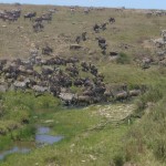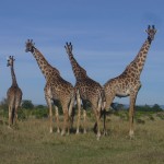 Der Masai Mara empfängt uns gleich mal mit sechs – wenn auch schläfrigen – Löwen. Es hat etwas paradiesisches, wie hier die schönsten Tiere zusammenleben, als hätte man sie hingesetzt. Im Fluss planschen Krokodile und Hippos, im Baum sitzen Affen und Geier, darunter stehen Elefanten und Giraffen, dazwischen tummeln sich Warzenschweine. Schließlich finden wir eine Gnuherde, die sich anstellt, einen Fluss zu überqueren – das berühmte crossing, das alle sehen wollen. Wir haben einen Superplatz und warten auf das Spektakel, aber irgend etwas hindert sie, immer wieder schrecken sie zurück, und wir fürchten schon, dass wir es sind, die ihnen Angst machen, weil wir zu nah dran sind. Als sie aber ganz abgezogen sind und auch wir weiterfahren, sehen wir den wahren Grund: zwei Hyänen am Flussufer, die ebenso enttäuscht abziehen wie wir. Aber ein paar hundert Meter weiter trauen sich die Gnus dann doch. Es ist zwar keiner der berühmten großen Flüsse, sondern nur ein kleiner, aber crossing ist crossing und wir haben dieses ganz für uns allein. Wir sind fasziniert von der Organisation der Herde von mehreren tausend Tieren und fühlen uns an Tuesday Night Skating in Frankfurt erinnert. Als Ordner fungieren hier Zebras, die viel besser sehen können, als Gnus, und – vielleicht auch deshalb – viel ängstlicher sind. Sie bilden die Vorhut, wittern, spähen und sichern nach allen Seiten, scheuchen die Gnus vorwärts, lenken sie um oder stoppen sie, wenn Gefahr droht, und am Ende halten sie das Feld zusammen. Wir genießen das Schauspiel, das für alle Gnus gut ausgeht. Danach finden wir noch ganz alleine einen Geparden, der selbstbewußt durch die Steppe wandert, abends gucken wir neben grasenden Giraffen in die Sterne und haben ein richtiges Afrika-Safari-Feeling.