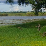 Den Caprivi-Strip ganz im Nordosten hatten wir uns etwas spannender vorgestellt… eigentlich geht es viele hundert Kilometer immer nur geradeaus durch recht eintoenige gruene Buschlandschaft. Aber wenigstens hat es aufgehoert zu regnen. Und am Ende des Caprivistreifens finden wir doch wieder ein kleines Paradies. Eine wunderbare kleine Lodge/Campsite direkt am Okavango-River, in dem sich erstaunlich tagaktive Hippos und wieder viele Krokodile suhlen. Alles ist voll bunter Voegel, die einem interessiert zuschauen und anschraepen wenn man die Freiluftduschen oder -toiletten benutzt, und ab und zu stolpert man ueber einen Waran. Wir geniessen die Natur, die Tiere und den Sonnenschein und machen uns dann auf den Weg nach Windhoek. Da haben wir am Sonntag eine Verabredung… 🙂
