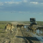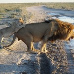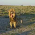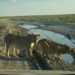 Bis zum echten haben wir noch ein paar Tage Zeit. Erst mal ziehen wir los nach Etosha um Tiere zu finden. Und das glückt! Schon am ersten Abend zeigt sich unser ersehntes Rhino am Wasserloch (yeah, wir haben unsere Big Five), und noch viele weitere sollen folgen. Wir gehen zu viert in einem Auto auf Game Drive, sehen Elefanten, Zebras und Giraffen und erspähen am zweiten Tag ein Rudel Löwen, das aus der Ferne zu einer Wasserpfütze vor uns auf der Straße geht, um dort zu trinken. Wir bleiben gebannt stehen, die Löwen stören sich nicht an uns, es werden mehr und mehr. Zum Schluss, als der große Boss mit der Riesenmähne auftaucht, von seinen Haremsdamen liebevoll begrüßt wird und mit den Babys spielt, sind es fünfzehn Löwen, die sich vor unserem Auto rekeln, in der Pfütze trinken, und sich in unserem Autoschatten ausruhen. Wir sind fasziniert. Andere Autos kommen dazu und fahren nach einiger Zeit weiter, aber von uns vieren kommt keiner auf die Idee, dieses Schauspiel freiwillig zu verlassen. Als wir abends ins Camp zurück müssen, haben wir die Löwen rund zwei Stunden aus nächster Nähe beobachtet und jede einzelne Minute atemlos genossen. Die fünf Nashörner, die sich abends am Wasserloch zeigen, gefallen uns natürlich auch noch, aber wir sind uns einig, dass sie unser Löwen-Erlebnis nicht toppen können.