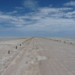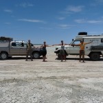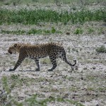 Am nächsten Tag müssen wir Etosha verlassen und witzeln schon, dass wir jetzt nur noch für Leoparden stoppen (die scheue Einzelgänger, wirklich schwer und meistens nur nachts zu finden sind), schwupps, da tauchen sie auf. Nicht nur einer, sondern ein Weibchen mit einem fast ausgewachsenen Jungen, am hellichten Mittag, sie queren vor uns die Straße, klettern auf einen Baum und machen fast noch Anstalten zu jagen. Wir können es kaum glauben. Ziemlich sprachlos gelangen wir an die eigentliche Etosha-Salzpfanne, eine gleißend helle, riesige leere Platte, brütend heiß, kahl und – wie wir finden – wunderschön.