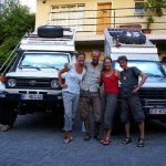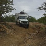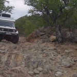 Wir fahren weiter in die Berge, immer höher und höher und nun wird die Straße wirklich schwierig. Immer steiler, immer enger, immer schroffer. Wieder und wieder steigen wir erstmal aus und begutachten die Geröllhalde, die da jeweils vor uns liegt. Wir schleppen Steine vor die schlimmsten Stufen und bauen uns – ich zugegeben mehr aus therapeutischen Zwecken – zum fotografieren auf. Jetzt habe ich wirklich Angst, dass das Auto umfällt oder aufsetzt oder sonstwie ernsthaft Schaden nimmt. Und zumindest ordentlich Respekt haben wir wohl alle vier. Aber was diese Autos können, ist unglaublich. Sie klettern förmlich, man das nicht anders nennen, Reifen um Reifen greifen sie um die Felsen und wuchten sich hoch, mit einer ungeheuren Kraft. Wir überstehen alles unbeschadet und haben an einem zehnstündigen anstrengenden Fahrtag knapp 50 km geschafft.