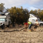 Da liegt noch einiges vor uns. Weiter und immer weiter geht es, nun bergab in die Wüste. Seit einer Woche haben wir nichts mehr einkaufen können, langsam geht alles Frische zur Neige, auch richtige Duschen haben wir lange nicht gesehen und mit unseren Wasservorräten müssen wir haushalten. Aber von Krisenstimmung keine Spur. Jeden Abend schlagen wir unser Lager an einem noch schöneren Platz in der Wüste auf, schleppen immer größere Holzbrocken für das Feuer an, teilen brüderlich unsere Essensvorräte, gucken in die Sterne und finden alles großartig. Die Weite und Einsamkeit um uns herum ist atemberaubend. Vor allem, wenn man auf einen Berg klettert, wirklich weit gucken kann, und doch nichts als weite Wüste sieht, ohne irgendwelche Anzeichen von Leben oder Zivilisation.