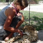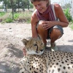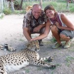 Die erste Übernachtung führt uns zu einer Farm, auf der Geparden/Cheetahs leben. Das Schild „Don’t enter, ring bell“ überzeugt uns sofort. Bei der ersten Begegnung mit den Geparden stehen wir alle vier stocksteif und vorsichtig, doch schnell kuscheln sich die Tiere an uns, legen sich schnurrend zu Boden, lassen sich genüsslich kraulen und schlecken unsere Hände. Unglaublich, so eine riesige schnurrende Schmusekatze, das ganze Tier zittert und brummt und klingt wie eine Art Traktor.
