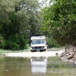 Der Kunene-Fluss, der ganz im Norden die Grenze zu Angola bildet, stürzt sich in Ruacana und Epupa in ziemlich spektakulären Wasserfällen in die Tiefe. Auch auf der Uferstraße hat sich ziemlich viel Wasser angesammelt, das wir manchmal gerade so noch durchfahren können, manchmal lieber auf steinigen steilen Offroad-Pisten umfahren. Wir nähern uns dem Land der Himbas, eines Volksstamms, der hier aufgrund der wirklich schwierigen Erreichbarkeit der Gegend noch fast unberührt nach seiner alten Kultur lebt. Die Frauen reiben sich komplett – inklusive der Haare – mit einer rotbraunen Paste aus Butter, Ocker und Kräutern ein, flechten sich Extensions (jawohl) in die Haare und sind zur Freude sicher nicht nur unserer Jungs samt und sonders barbusig und lediglich mit einem kunstvoll drapierten Lederrock und einigen Riemen bekleidet sowie aufwendig geschmückt. Verständigen können wir uns mit den Himbas praktisch nicht, und die Kamera finden sie entweder furchteinflößend oder sie wollen doch schon wieder Geld haben. Bei ein paar Kindern jedoch siegt die Neugier und so können wir wenigstens einige wenige Fotos machen. Die schönsten Himba-Bilder aber müssen wir in unseren Köpfen aufbewahren.