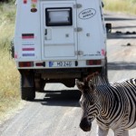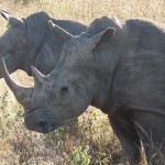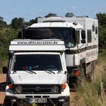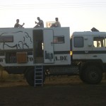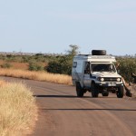 Zusammen mit Tom und Dagmar stürzen wir uns ins wohl berühmteste Tierparadies der Erde. Die beiden haben ihren Truck „Rhino“ getauft – und auch entsprechend bemalt – aber gesehen haben sie auf ihrer Reise noch keines. Dies soll sich hier schnell ändern. Auch wir haben bisher nur Spitzmaulnashörner/Black Rhino gesehen, hier aber gibt es große Mengen von Breitmaulnashörnern/White Rhino, und die sind wesentlich größer und imposanter als ihre Namensvettern. Und sehr folgsam. Wir bugsieren unsere Autos eine Weile hin und her, laden sie freundlich ein, zwischen uns die Straße zu überqueren, und das machen sie dann auch, sogar mehrmals. Uns gelingen schöne Fotos von unseren Autos zusammen mit diesen mächtigen Tieren, die uns viel Spaß machen. Die Raubkatzen machen sich ein wenig rar und lassen sich nur von weitem blicken, aber wir finden jede Menge anderer Tiere, nicht nur unterwegs. Auf dem einen Camp wohnen Warzenschweine/Warthogs, beim nächsten streifen abends Hyänen um den Zaun und nachts kommen die Hippos zu Besuch. Eines Nachts reißen die Löwen einen Büffel kaum 200 Meter von unserem Camp entfernt – am nächsten Morgen können wir die übriggebliebenen Hufe und Hörner bewundern. Der Park ist zwar lange nicht so ursprünglich wie die meisten anderen, die wir gesehen haben, aber dafür riesengroß und voller unterschiedlicher Landschaften. Wir genießen Dagmars Kochkünste und werden abends auf die Sundowner-Terrasse (auf ihren Truck) eingeladen. Außerdem werden wir von Thomas kommunikationstechnisch etwas näher an die Welt herangebracht. Was sich in der arabischen Welt tut, verfolgen wir schon seit einigen Wochen abwechselnd mit Entsetzen und hoffnungsvoller Spannung, genau wie wohl der Rest der Welt und sicherlich wie alle anderen die wie wir diese Region kürzlich durchfahren haben oder auf dem Weg dahin sind. Nun erfahren wir von der Apokalypse, die über Japan hereingebrochen ist, und können die schrecklichen Bilder und Nachrichten kaum glauben. Unsere eigenen Probleme nehmen sich dagegen lächerlich aus: unser Elektrizitätsproblem ist bereits seit Mozambique wieder da, unser Konverter arbeitet nicht und wir können unsere Kabine nur mit fremder Hilfe mit Strom versorgen. Nach fast einer Woche im Kruger-Park, die für uns nur durch Tom, Dagmar und ihrem technischen Equipment möglich war, müssen wir zurück zu unserem Autoelektriker nach Louis Trichardt/Limpopo und unserem Freund Dave nach Camp Africa.