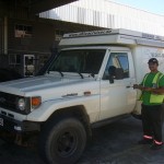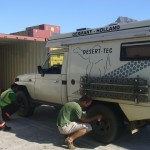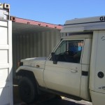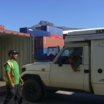 Dieses Auto war noch nie in einem Container, aber man hat uns gesagt, dass es so gebaut wurde, dass es genau in einen hineinpasst. Mit herausgelassener Luft aus den Reifen, das war uns schon klar. Aber dass es so eng werden würde, hätten wir nicht gedacht. Der erste Anlauf muss abgebrochen werden. Quasi auf den Felgen rollen wir mit angehaltenem Atem im zweiten Anlauf in den Container. Geschafft! Holzblöcke werden in den Boden des Containers genagelt, damit der Wagen sicher steht, dazu wird er mit superstarken Gurten festgezurrt, aber zur Seite ist nicht viel Platz. Also kommt noch ein Airbag dazwischen. Ok. Klappe zu, der Zoll macht sein Siegel darauf, fertig. Bloss, dass in all der Hektik niemand daran gedacht hat, die Frontbatterien vorschriftsmäßig abzuklemmen. Aber die Ankunft unseres Schiffes verzögert sich immer weiter und ein paar Tage später darf Marc mit Sondergenehmigung ins Hafengebiet, um nochmal in den Container krabbeln und die Batterien abzuklemmen. Uff.